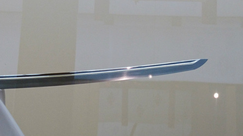 宝物殿での展示は刀剣鑑賞としてはちょっと見づらい部分があります。刀身真ん中は布があって見えません。しかし反りの強さや研がれて細く小さくなった鋒部分、下から覗くように見ると茎側にくっきりと刃文を確認することができます。