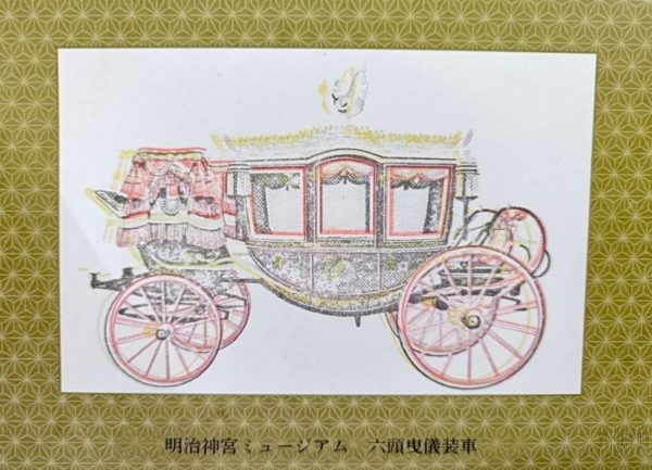展示室は1階・2階と分かれており、1階には神宮本殿のジオラマや季節の行事などで使用される道具が展示してありました。2階には明治天皇にまつわるものがメインで展示されています。2階展示室の中央にドンと配置された馬車「六頭曳儀装車」が豪華で圧倒されました。目玉の展示なのでしょう。来館記念スタンプのモチーフにもなっていました。